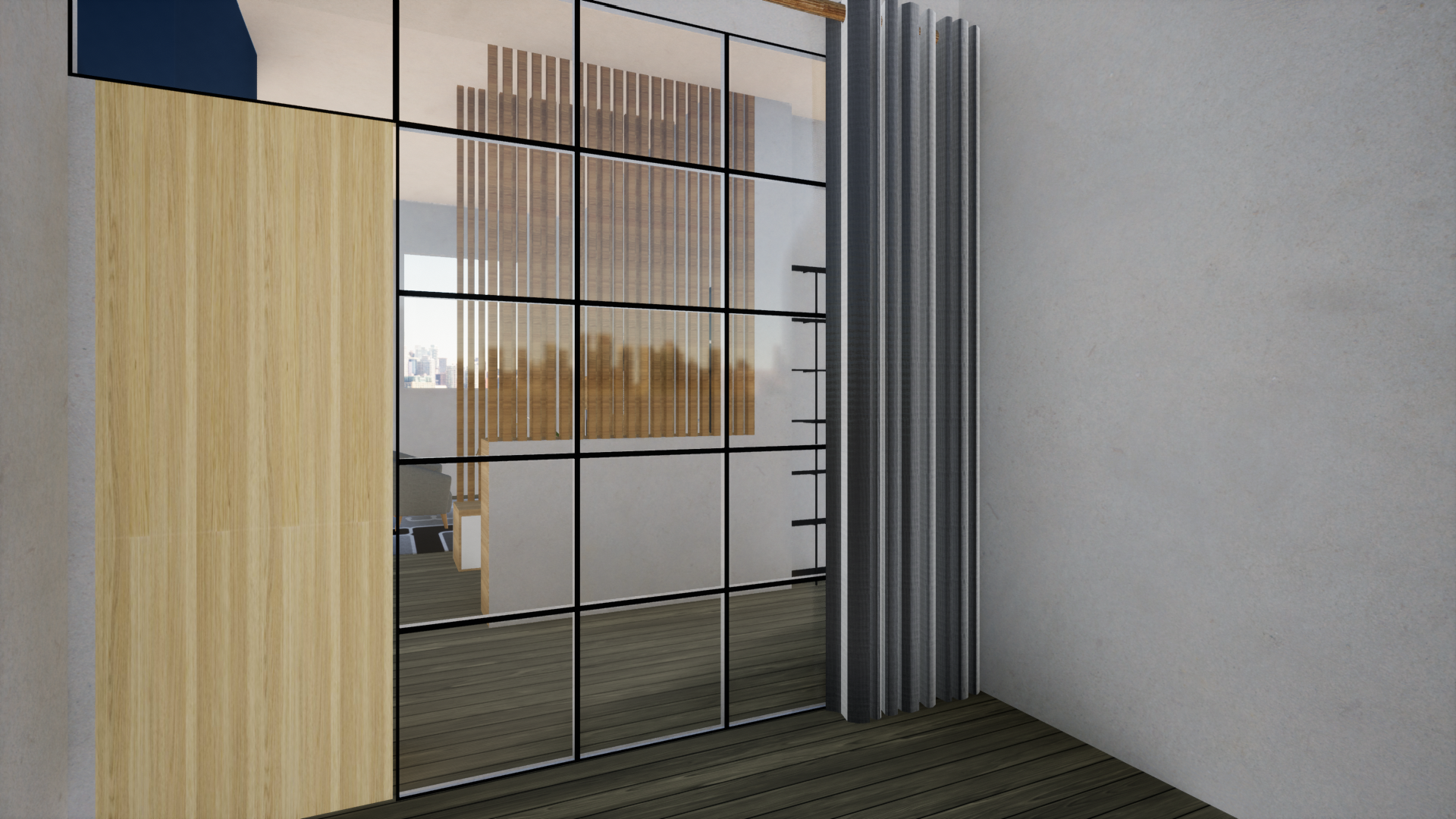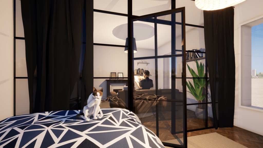 - une coin nuit/bureau avec une verrière atelier
