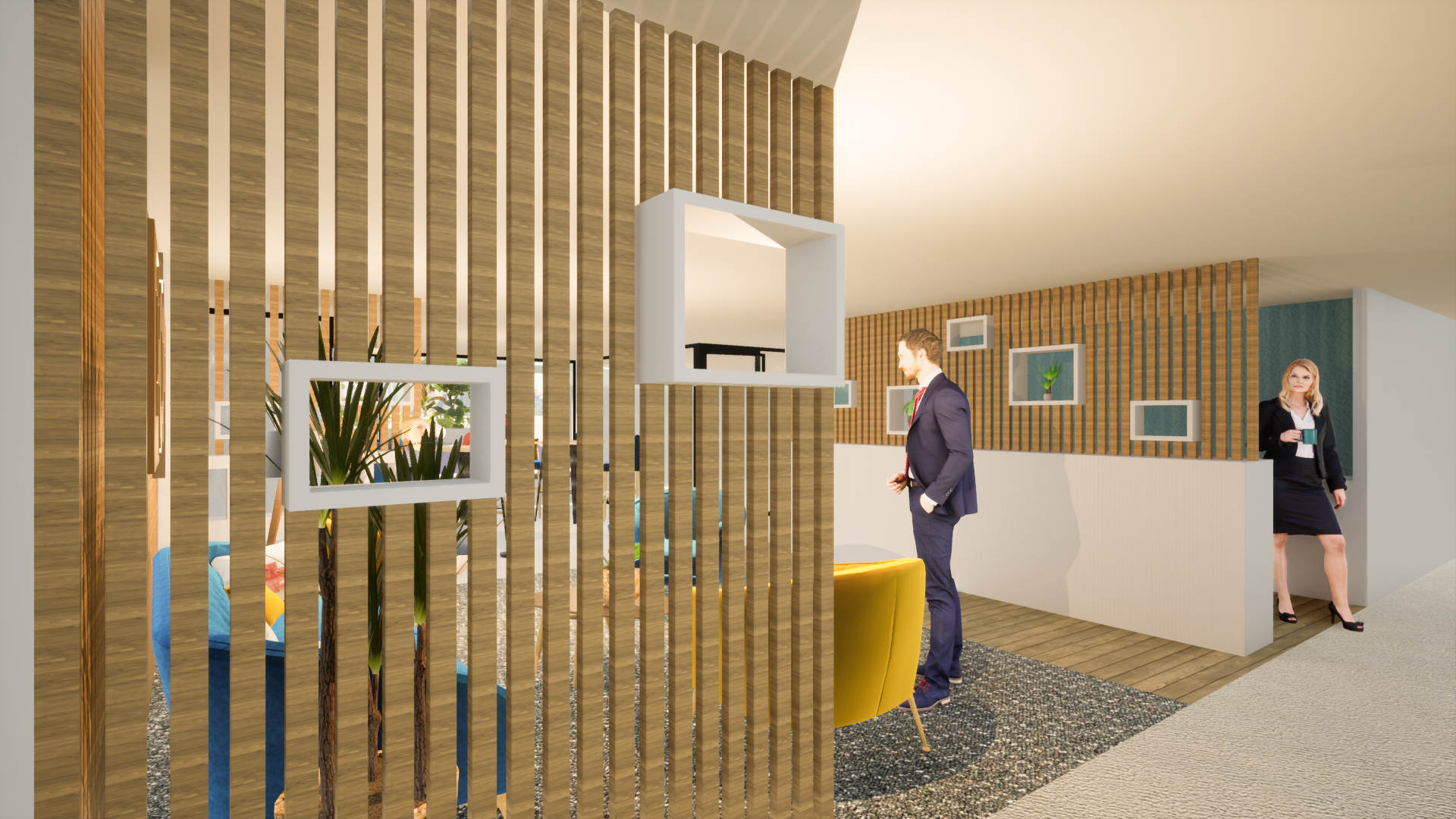 La création d’un bardage avec des tasseaux de bois apporte une ambiance chaleureuse. Le mobilier est aux couleurs de l’entreprise et amène un côté dynamique.