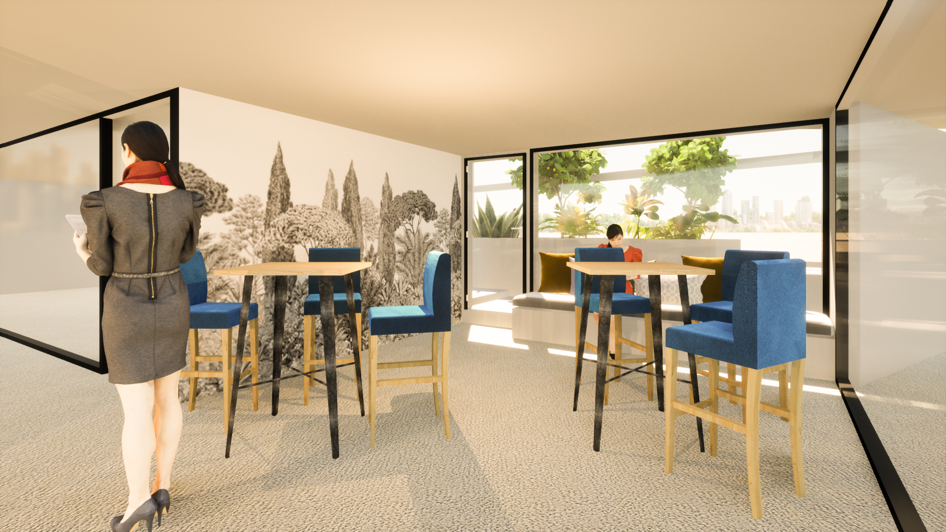 Un papier peint rappelant le paysage de la forêt créé une continuité avec l’extérieur, amenant la nature à l’intérieur des bureaux.