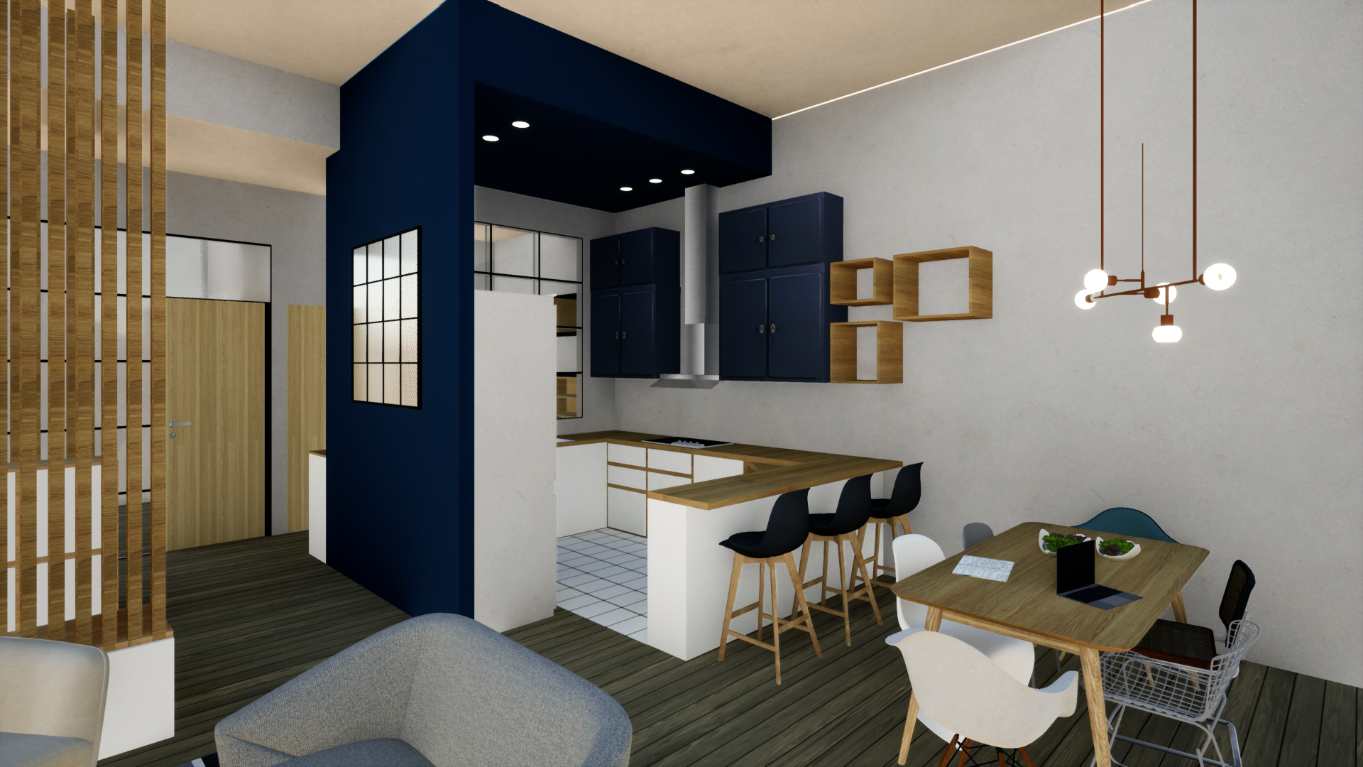 - une grande pièce à vivre lumineuse avec cuisine ouverte, délimitée et mise en valeur par son plafond décaissé et sa verrière sur mesure permettant d’éclairer le couloir. Cet espace permet d’avoir 3 fonctions (cuisine, salle à manger et salon) ayant accès une terrasse.