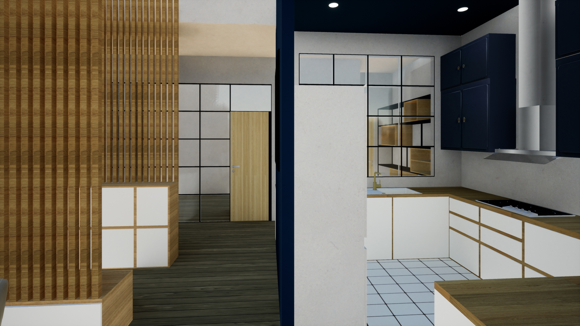 Séparation de la cuisine filante et du séjour à l’aide d’un claustra avec des rangements et une banquette
