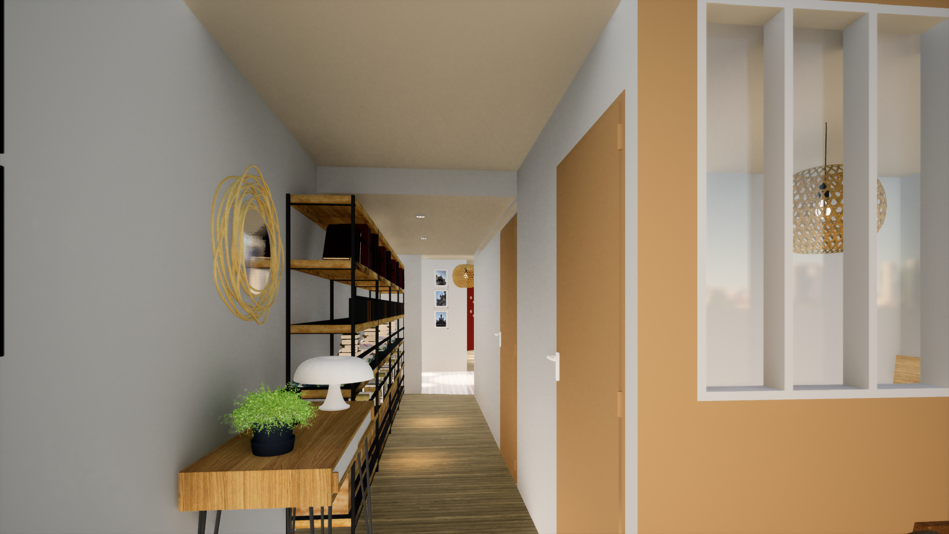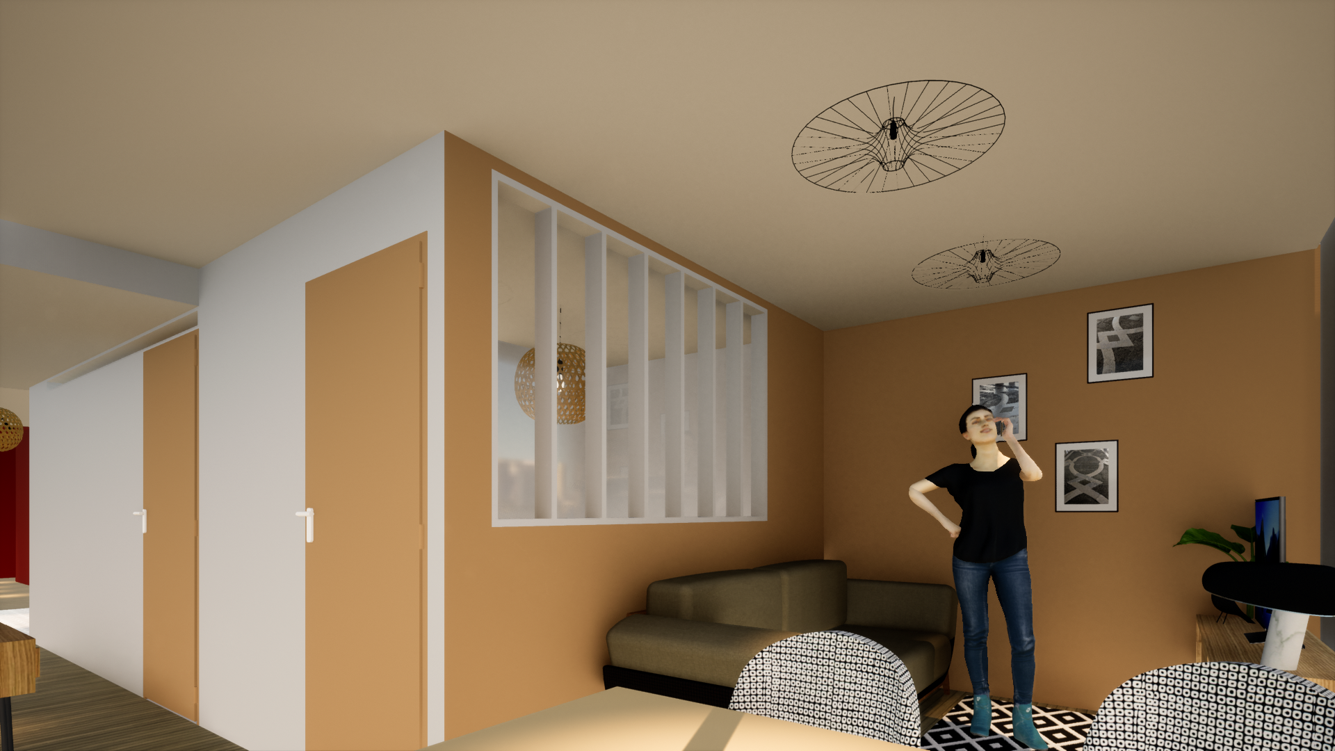 - une entrée délimitée à l’aide de claustras pour optimiser la lumière. Elle comporte une banquette et des rangements pour les chaussures.