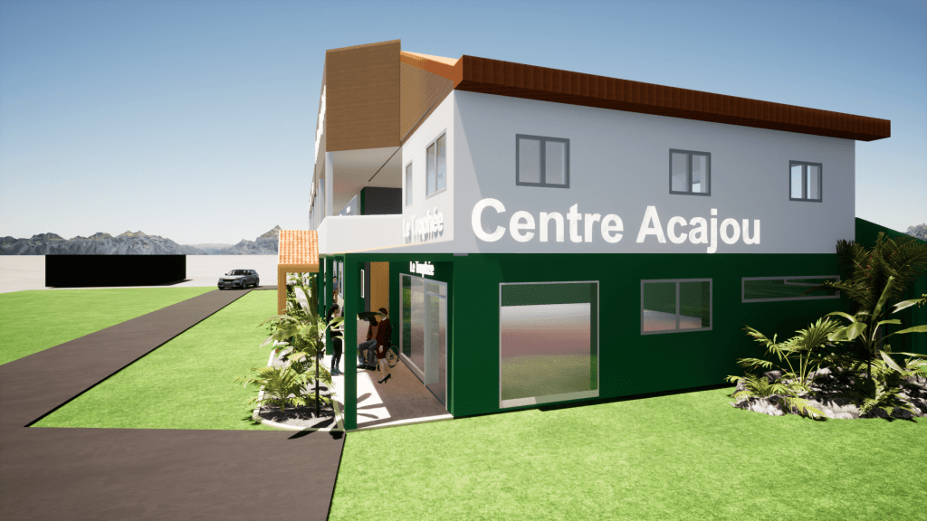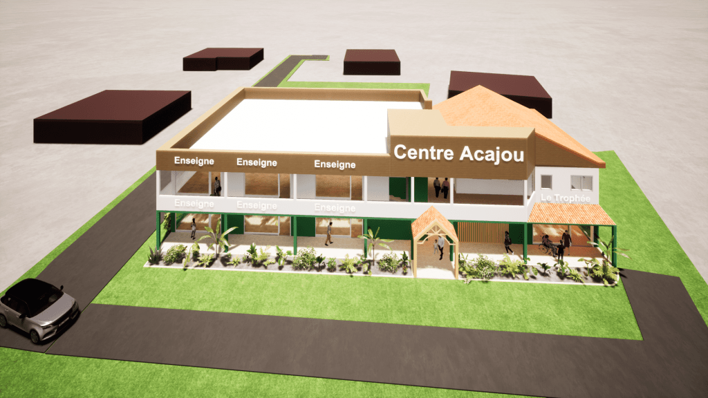 - La nouvelle façade est attractive ! Elle est composée d’un revêtement dans les tons vert au RDC, pour se fondre avec la végétation tout en attirant le regard sur les belles vitrines. A l’étage, le revêtement blanc est de mise afin d’alléger visuellement l’enveloppe et renvoyer la chaleur de ce milieu tropical. Le bandeau au sommet du bâtiment dans les tons bois apporte une ambiance chaleureuse, rappel de la nature et mettant en valeur la signalétique.